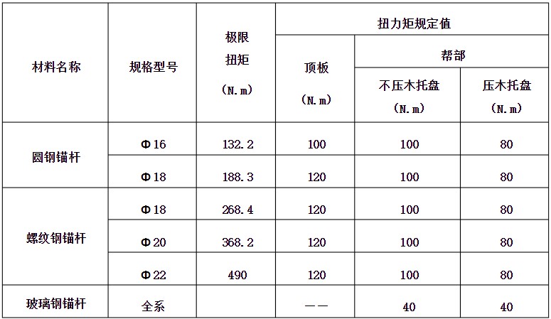 (一)表中扭力矩規(guī)定值為要求支護質(zhì)量的數(shù)值,各礦可根據(jù)礦內(nèi)實際情況對錨桿扭力矩值做適當調(diào)整,但不得低于此表規(guī)定的數(shù)值。