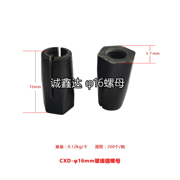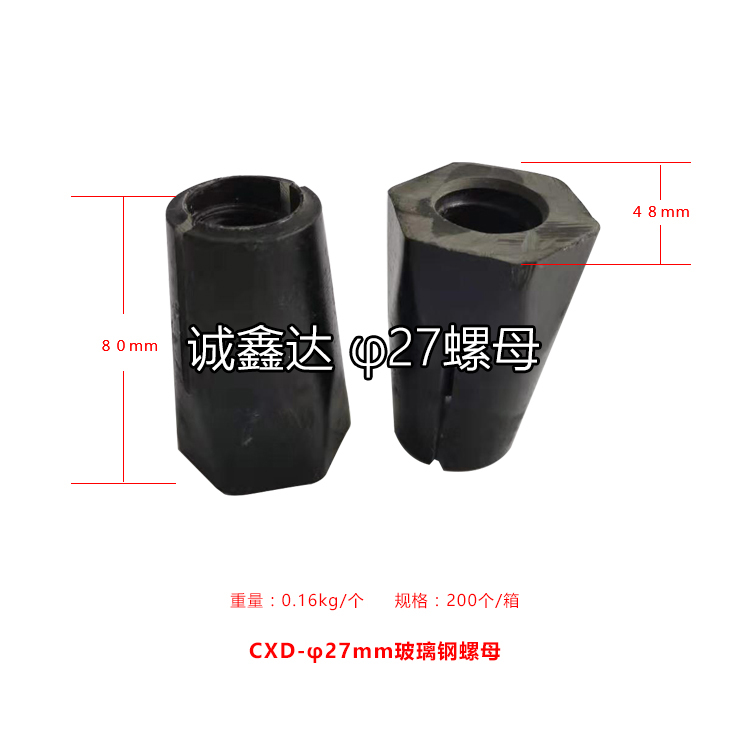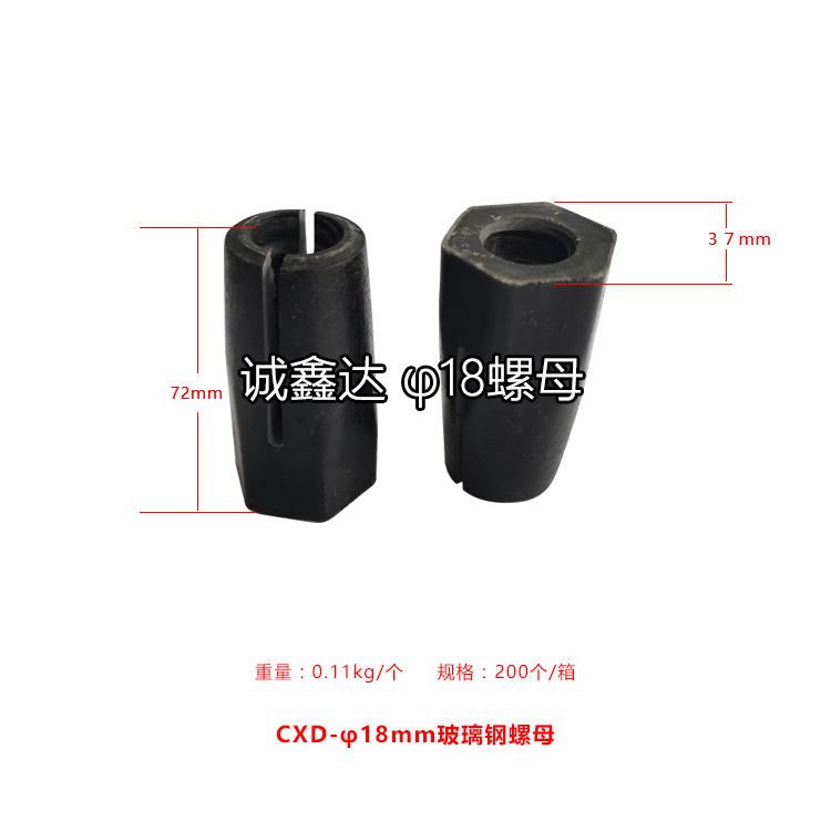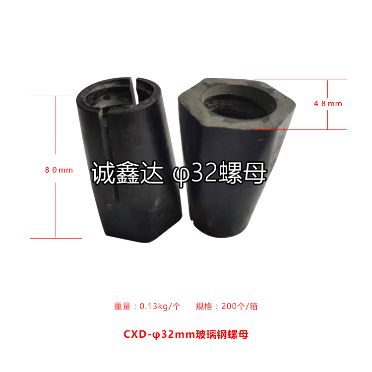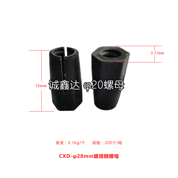 作為礦山支護(hù)配件,山西誠鑫達(dá)研發(fā)了一種高抗拉強(qiáng)度的玻璃鋼螺母,螺母本體開有內(nèi)螺紋孔,在內(nèi)螺紋孔孔壁設(shè)螺紋,螺母本體的前部分外形為錐形且用于與托盤緊密配合,在螺母本體的前部分的錐形面開設(shè)有通槽,螺紋孔的前部呈喇叭形,這樣螺紋孔的前端直徑大于后端的直徑,進(jìn)入托盤錐形孔后,螺母本體的前端和中部同時收縮,使螺母本體的內(nèi)螺紋與錨桿外螺紋緊密配合,拉緊長度增加到25mm—30mm,擴(kuò)散了應(yīng)力,使抗拉強(qiáng)度明顯提高。